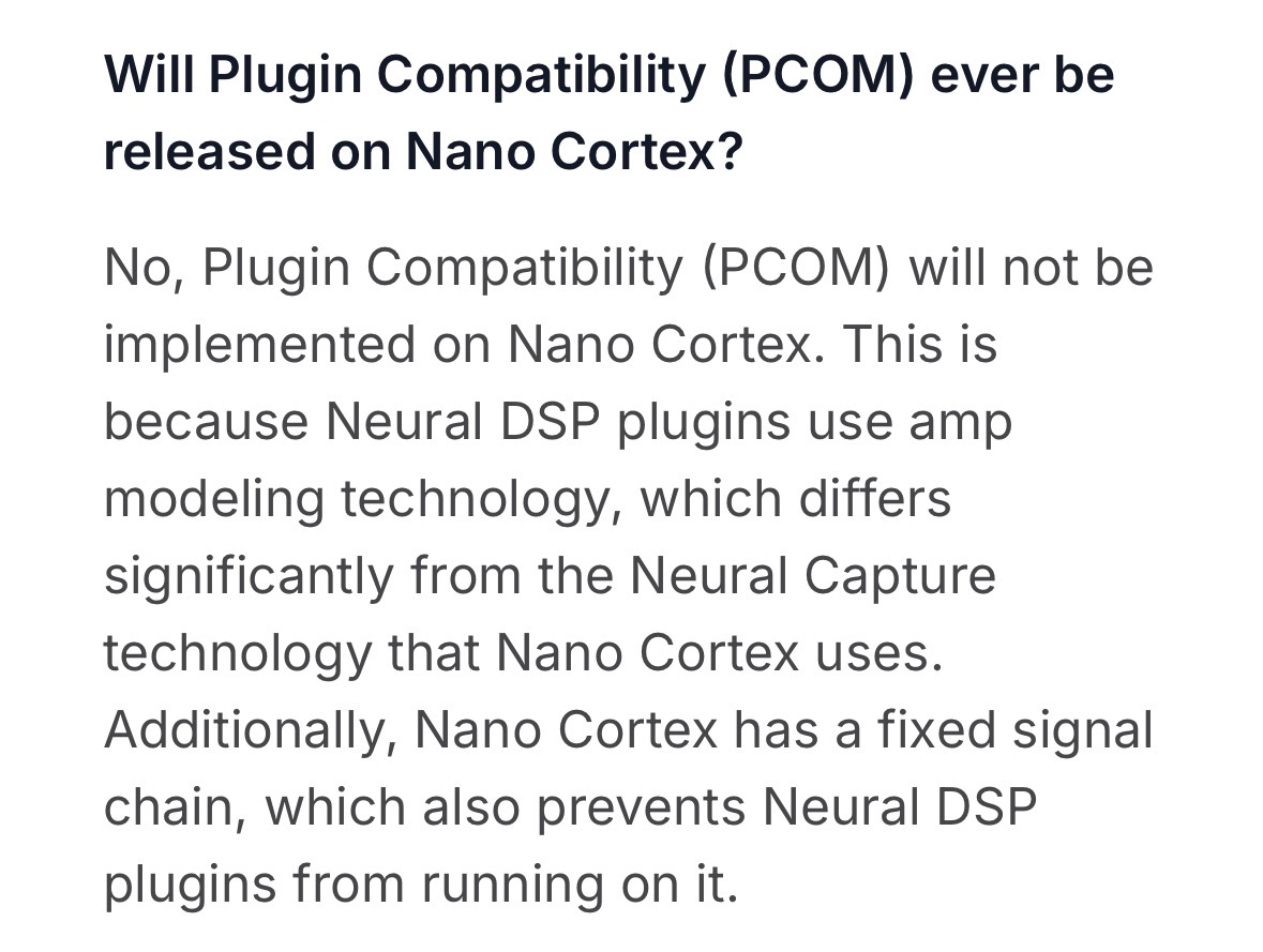 When Nano Cortex came out, the market was completely different—the only competitors were Tonex and Kemper Player. Now, it’s hard to impress anyone with the use of neural captures. Therefore, in my personal opinion, the only reason why this feature wouldn’t be added is technological limitations. The link you provided specifically refers to plugins. So, I see no reason why we can’t request this feature. And I think the guys at NeuralDSP understand this themselves. It’s a great idea to turn Nano Cortex into a stripped down and totaly simplified version of Quad Cortex, instead of capture player only.