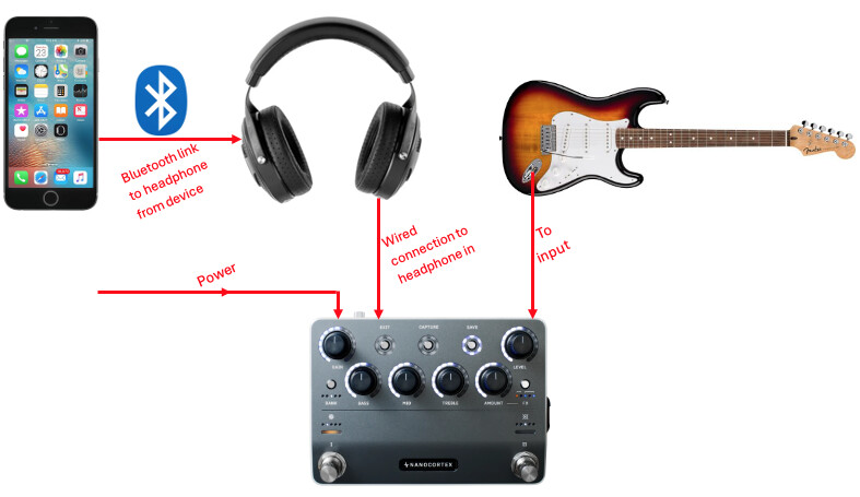 But since you stated that you want to play on headphones, you’d be looking for a pair of headphones that can mix the audio from the NC via wired connection to the headphone in, along with Bluetooth simultaneously (which would sync to your source audio device i.e. your phone playing a backing track). Here’s an idea of the ‘chain’ so to speak:
